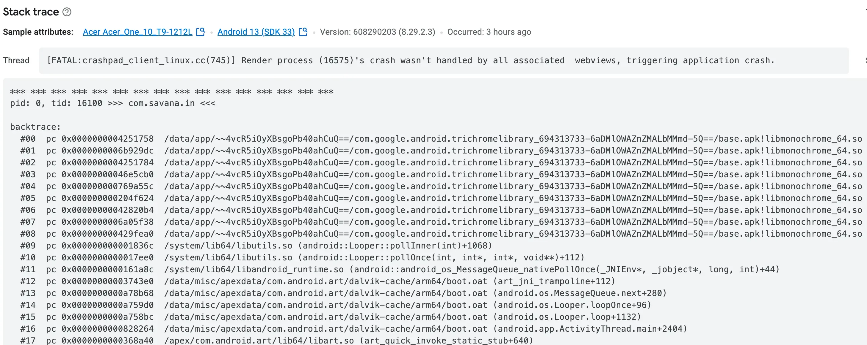 在使用基于 Chromium 内核的 WebView 时,Crashpad 是常见的用于捕获和上报崩溃信息的工具。错误日志中的内容表明: