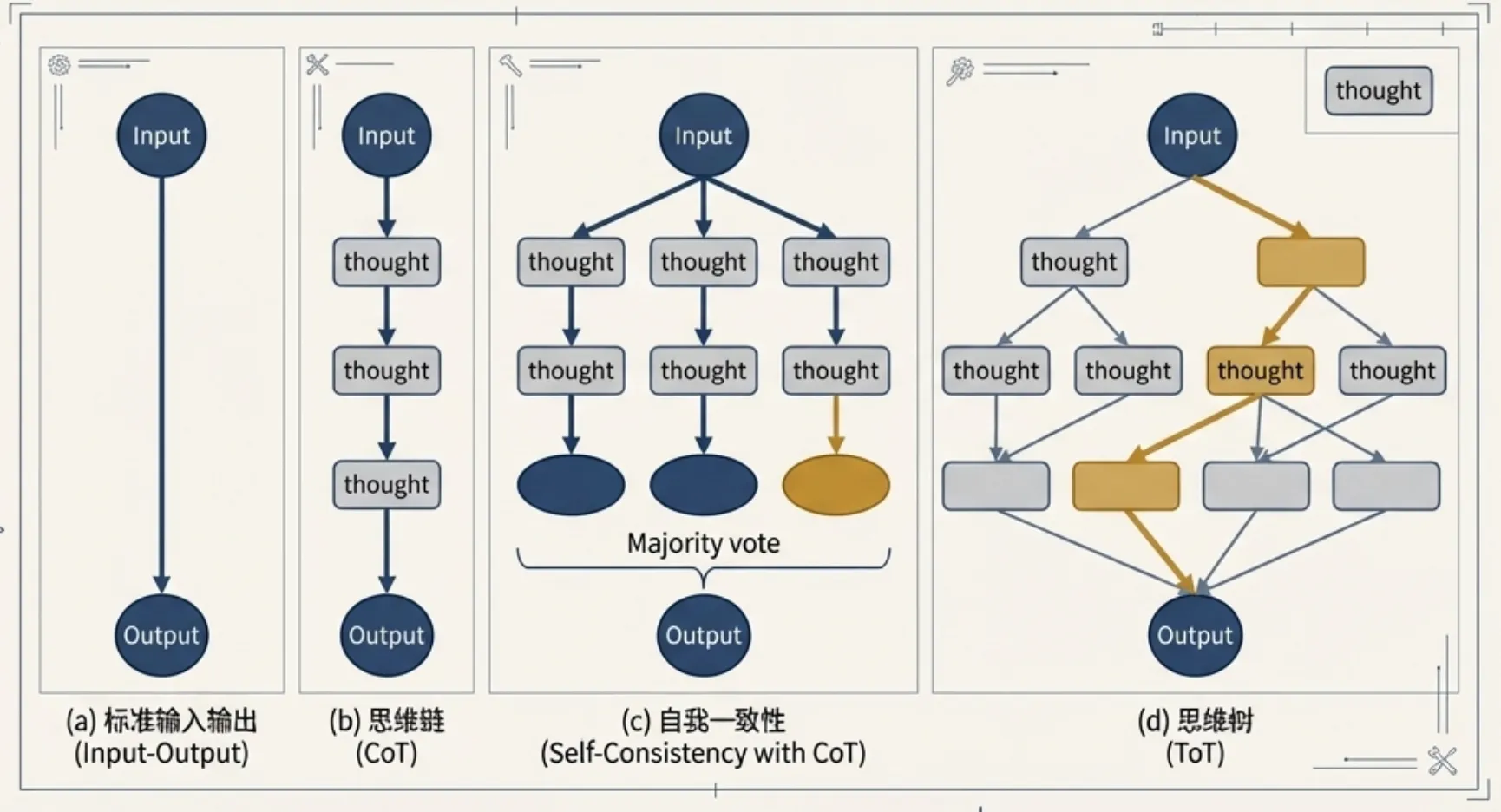 思维链(CoT)技术的出现是 LLM 推理能力的一大飞跃。其核心原理是 通过引导模型生成一系列中间推理步骤,最终得出答案。相比于直接输出结果(Standard Prompting),CoT 模拟了人类解决复杂问题的思考过程,这使得模型能够分解问题、逐步求解,从而在算术、常识和符号推理等任务上取得显著的性能提升。